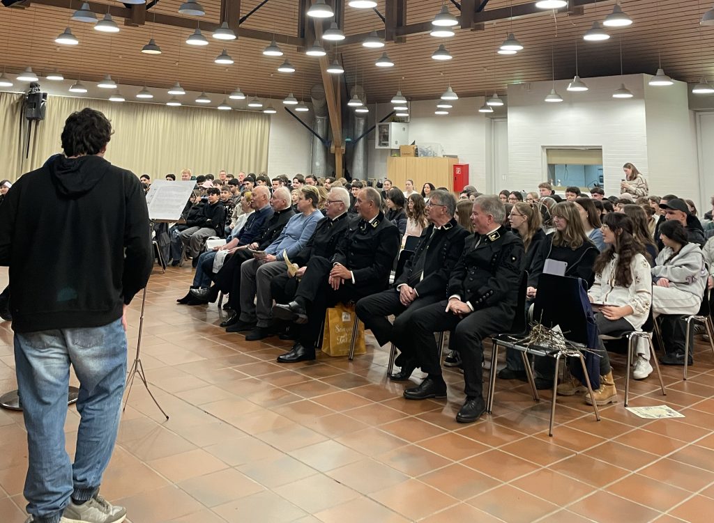 Zwischen Schüler*Innen nahmen auch in Bergkitteln gekleidete Vertreter des Bergbaus Platz. Moderiert wurde die Veranstaltung von Lehrer Rainer Legant, der gleich zu Beginn daran erinnerte, wie eng die Schule mit der Bergbautradition verbunden ist. Schließlich liegt das ehemalige Zechengelände ganz in der Nähe – und auch der Namensgeber der Schule, Fritz Winter, war nicht nur Künstler, sondern einst selbst Bergmann.