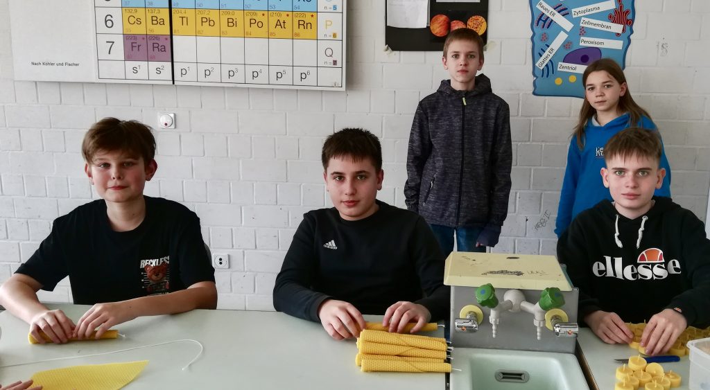 Der Verkauf von selbst hergestellten Bienenprodukten in der Vorweihnachtszeit hat bereits Tradition. Direkt nach den Herbstferien hat eine Gruppe von etwa 12 Schülerinnen und Schülern der Fritz-Winter-Gesamtschule mit der Produktion begonnen. Nachdem es für einige aus dieser Gruppe schon die fünfte Verkaufssaison ist, wurden jüngere Schülerinnen und Schüler in die Gruppe integriert. Gearbeitet wird dabei zweimal wöchentlich in der Mittagspause. „Für die Schülerinnen und Schüler ist das eine sinnvolle Pausenbeschäftigung in einer lockeren Atmosphäre“, so Lehrer René Poloczek. Neben Honig sind auch die Fritz-Winter-Lippenpflegestifte ein echter Renner, die nur aus Jojobaöl, Sheabutter, Bienenwachs und Propolistropfen hergestellt werden.